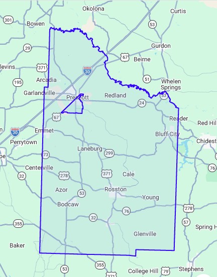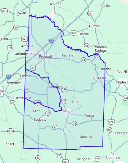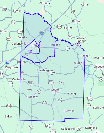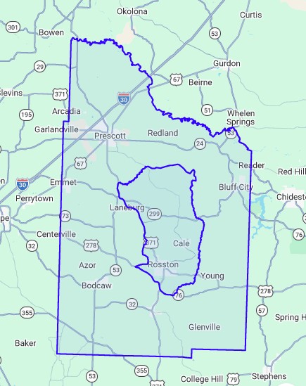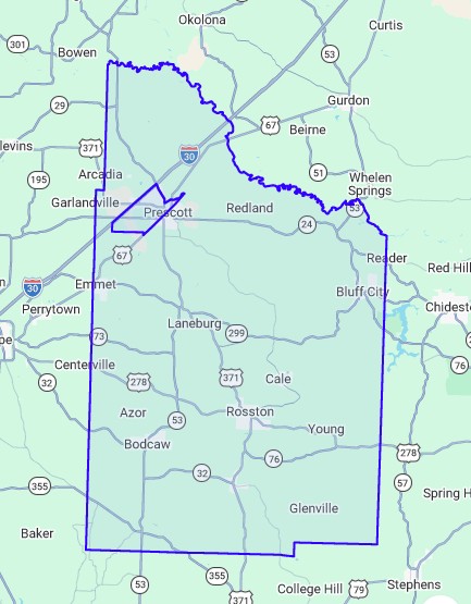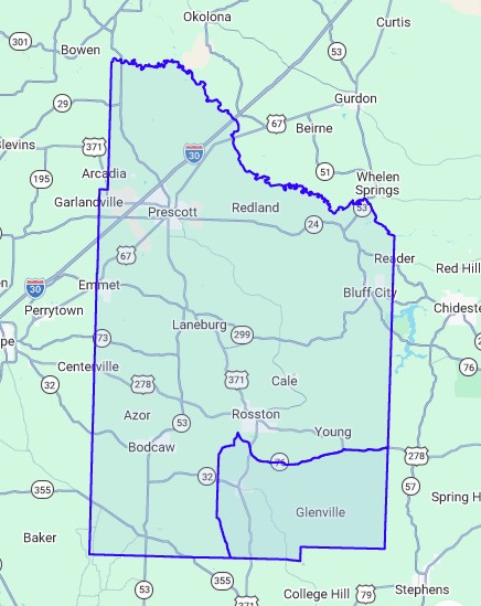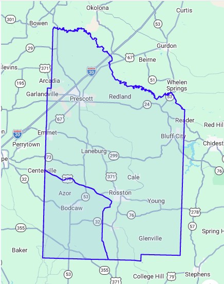 Southeastern Nevada CountyEast of Nevada 17 and south of Nevada 36, west of US 371, south of Nevada 76, and south of US 278 to the Ouachita County and Columbia County lines. Includes Troy, Glenville, Mt. Olive, Pleasant Grove, Pleasant Hill.